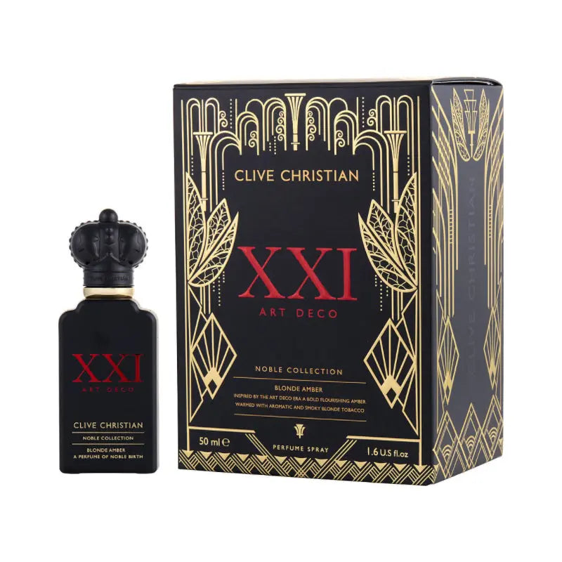 Launch year: 2022. Top notes: Bitter orange, Rum, Ginger, Cardamom, Pink pepper, Olibanum, Bergamot, Grapefruit. Heart notes: Tuberose, White tobacco, Dried fruits, Sandalwood, Jasmine, Orris, Saffron, Osmanthus. Base notes: Tonka bean, Vetiver, Labdanum, Myrrh, Patchouli, Musk, Cedar, Vanilla. Design house: Clive Christian. Scent name: Blonde Amber. Category: Perfume. Type: XXI Noble Collection Art Deco. SubType: EDP Spray. Size: 1.7 oz. Barcode: 652638010670. Clive Christian XXI Noble Collection Art Deco Blonde Amber EDP Spray 1.7 oz Fragrances 652638010670.